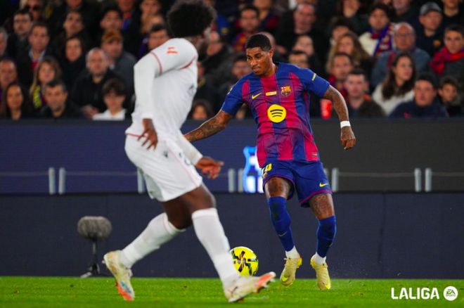 第70分钟,巴萨终于打破僵局,佩德里送出妙传,拉菲尼亚简单晃动过后,突然起脚,门将反应不及。